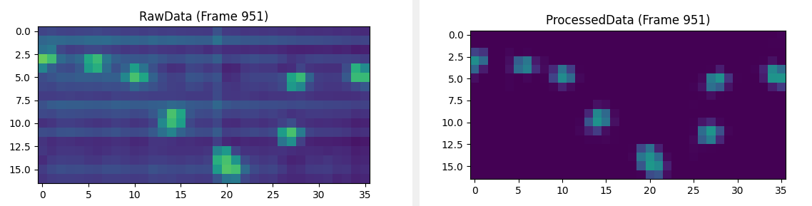 左侧为原始触摸电容矩阵数据(RawData),右侧为经模型处理后的输出结果(ProcessedData)